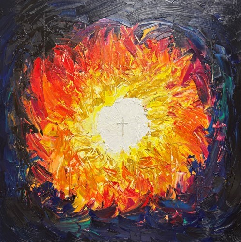 Created in conjunction with an Acts sermon series, this piece captures the transformation of Jesus’ disciples—from hiding behind locked doors to proclaiming the gospel with boldness. The stormy edges represent fear, while the blazing center radiates the Spirit’s power—turning fear into fearless faith.