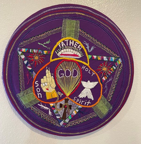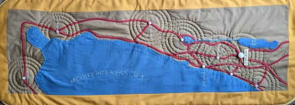 This embroidered, quilted map of the Ancient Near East is meant to highlight the established Roman roads of the First Century. I quilted four circles around each city for the four gospel accounts of Jesus’ life. I used gold thread for these circles for the holiness of the message being spread. Our God often uses the evil of the world to reveal his goodness. The most obvious example in Scripture is in the object of the cross: made to create fear and submission–an execution device of the highest cruelty, an emblem of despair. Through Christ’s death and Resurrection it became a symbol of eternal hope and grace. Similarly, the Roman roads, once an instrument of oppression and subjugation by an ever-expanding pagan Empire, became the way for members of The Way to travel safely and swiftly to spread the good news of Jesus Christ. The Roman roads helped deliver the message that the Roman cross had been the altar on which the Lamb of God was slain, who took away the sin of the world, that Christ lived, and was eager that the entire world–to the ends of the earth–would come to know and love him. We cannot underestimate the importance of the infrastructure that was established and prepared for the perfect moment when the good news was ready to be shared.