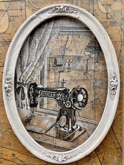 This mixed media piece reflects the biblical story of Tabitha, a seamstress revived through Peter’s prayer, and honors my own “Grandma Needa”, (also a seamstress) who lived a life of quiet faith and service. I used vintage sewing patterns, her antique Singer machine, and a window view of her backyard to form the backdrop, layered with symbols and images from my childhood.  The painted oval frame suggests a mirror, inviting viewers to look in & consider the legacy of faithful women like Tabitha and my Grandma. Just as Tabitha & her friends were reunited in this scripture, because of the hope my grandma passed on to me through Jesus, I look forward to being reunited with her again in heaven.