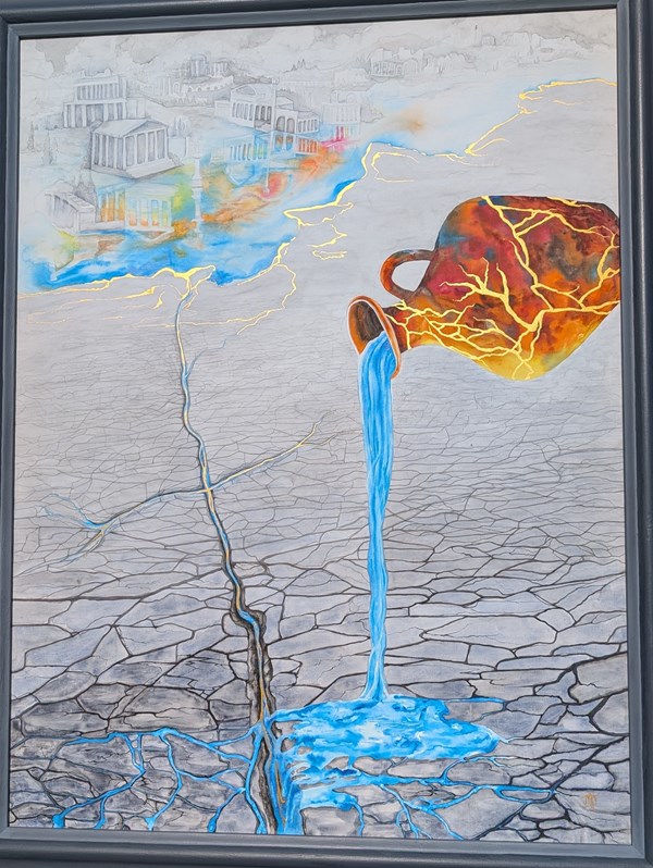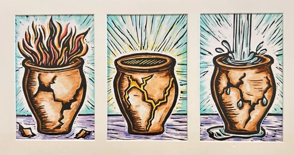 Each vessel reflects a stage in the transformation of the early church: purged by holy fire, strengthened through suffering, and filled by the Holy Spirit. The center vessel, repaired with gold in the style of kintsugi, symbolizes the present, a community made whole not by avoiding hardship, but by persevering through it.