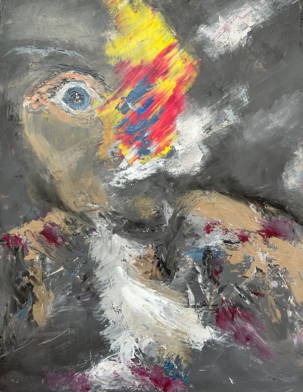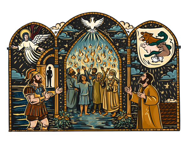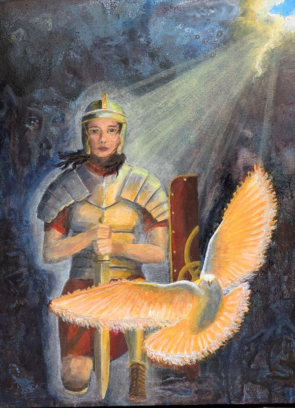 This painting explores some of the profound shifts in spiritual identity and relationship with God occurring in the first century AD, following the death and resurrection of Jesus Christ. At its heart are two central figures: an armored warrior, representing the new Gentile believer, and the Holy Spirit, depicted as a fiery dove – a symbol of divine presence, power, and purity.