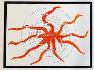 After reading Acts, an image immediately came to my mind: in the centermost circle is the word Pentecost, and diluted yellow and red acrylic ink depicts the visible flames that settled on each believer, enabling them to spread the Gospel. The radiating circles represent time and distance as the Gospel is spread. The ink “flames,” representing the Holy Spirit, also radiate out further through time and distance.