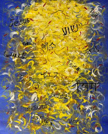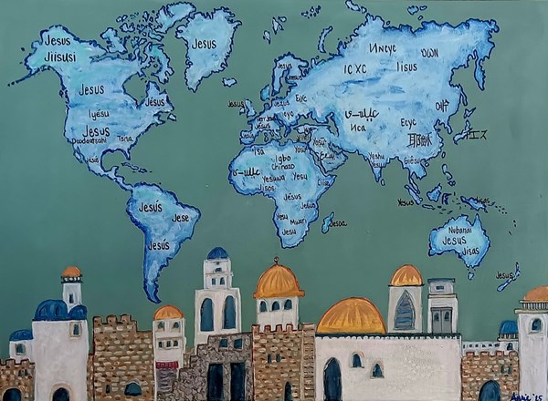 In the Book of Acts, we see Jerusalem’s central role as the geographic and spiritual starting point for Christianity. For this reason, I painted Jerusalem at the base of the canvas. Using acrylics in whites, grays, and browns for the sturdy stone walls, whitewashed buildings, and golden metallic domed rooftops, Jerusalem stands as both origin and anchor of the early church. From this city, the knowledge and worship of Jesus has radiated outward, across borders and cultures, in many languages throughout the world. I chose to capture this outpouring of the Holy Spirit by stenciling our world with the name of Jesus written in various languages – each script and sound an affirmation from Acts 2:5-11, that “every nation under heaven” hears the mighty works of our God.