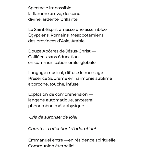 Fluent in both French and English, I set out to write a poem that would, for a moment, immerse the reader in an experience of instant foreign language comprehension in order to feel a sense of surprise and wonder like the people did on the day of Pentecost. Without a single French lesson and a little guesswork based on similar spellings, the reader should be able to participate actively in the scene revealed in Acts 2.