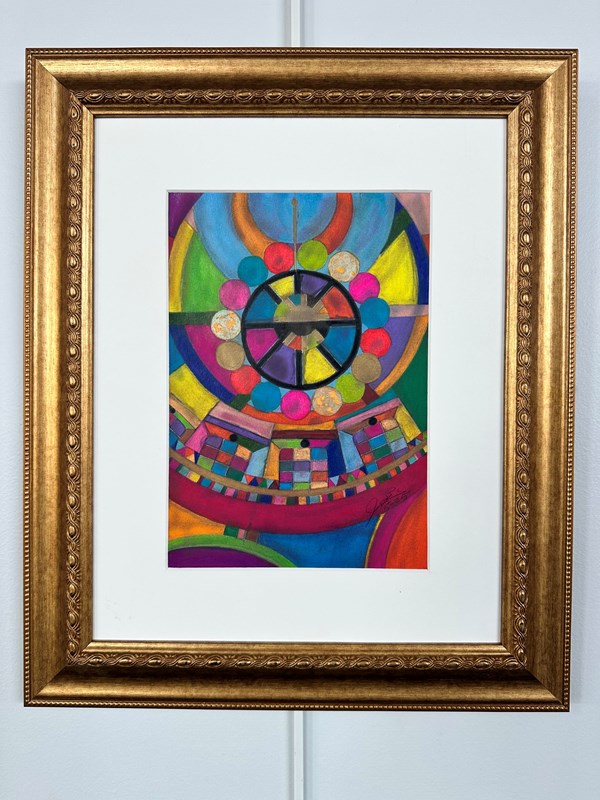 This drawing was made using a plastic card and a penny as stencils. It represents the dome of the Arkansas State Capitol rotunda. The vibrant colors symbolize the diversity of people around the world, with the central globes representing various continents.